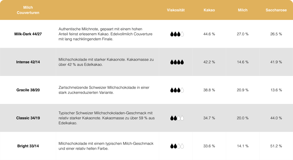 Unsere Couverturen werden in der Schweiz aus sorgfältig ausgewählten Rohstoffen nach traditionellen Verfahren hergestellt. Das breite Sortiment umfasst Milch-, dunkle und weisse Couverturen mit individuell abgestimmten Geschmacksprofilen, die perfekt auf Ihre Produkte und Anforderungen zugeschnitten sind. Dank ihrer hervorragenden Eigenschaften eignen sich unsere Couverturen für vielfältige Anwendungen und erfüllen dabei höchste Qualitätsansprüche.